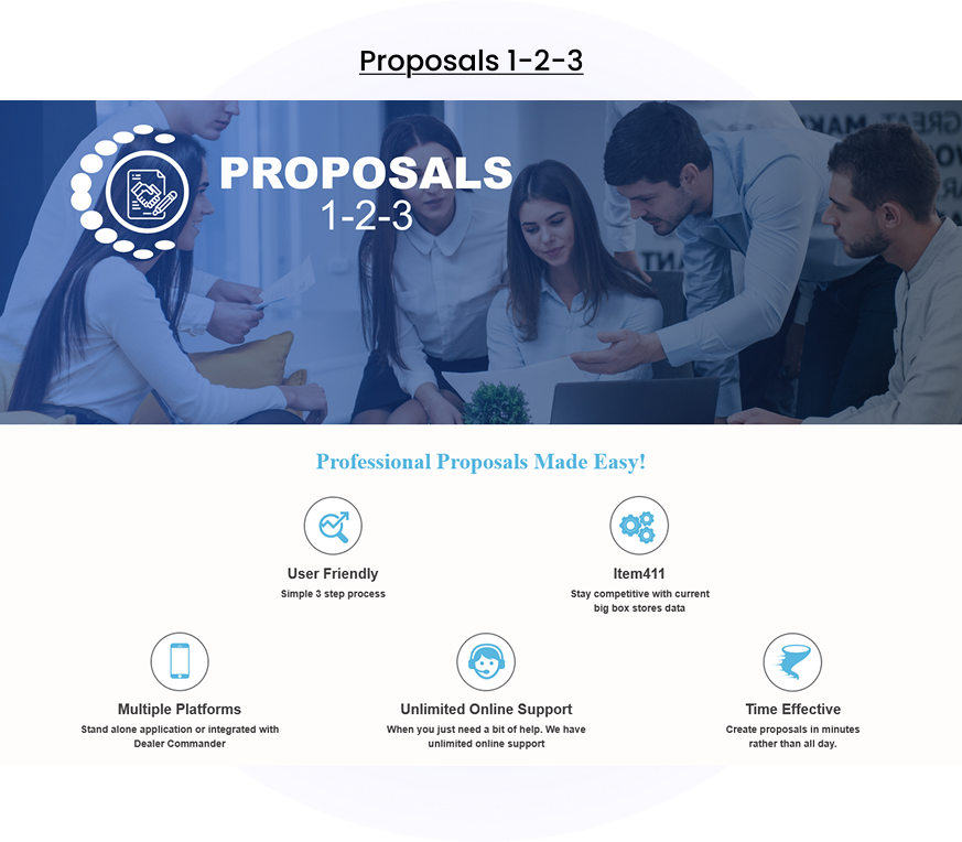 Whether used as a standalone solution or integrated with Dealer Commander, it fits seamlessly into existing workflows. With unlimited online support, help is always within reach. Built on a legacy of innovation since 2000, Proposal 1-2-3 continues to deliver powerful competitive intelligence tools tailored for independent dealer success.